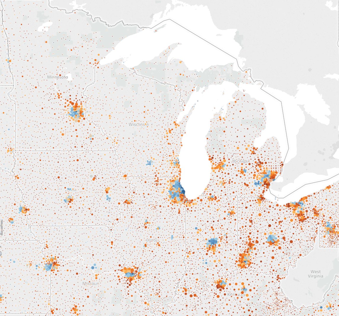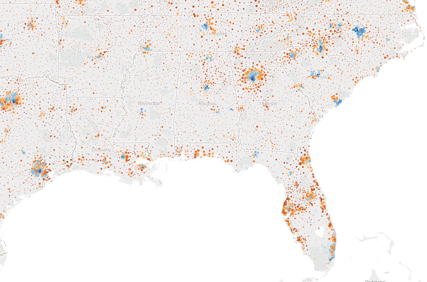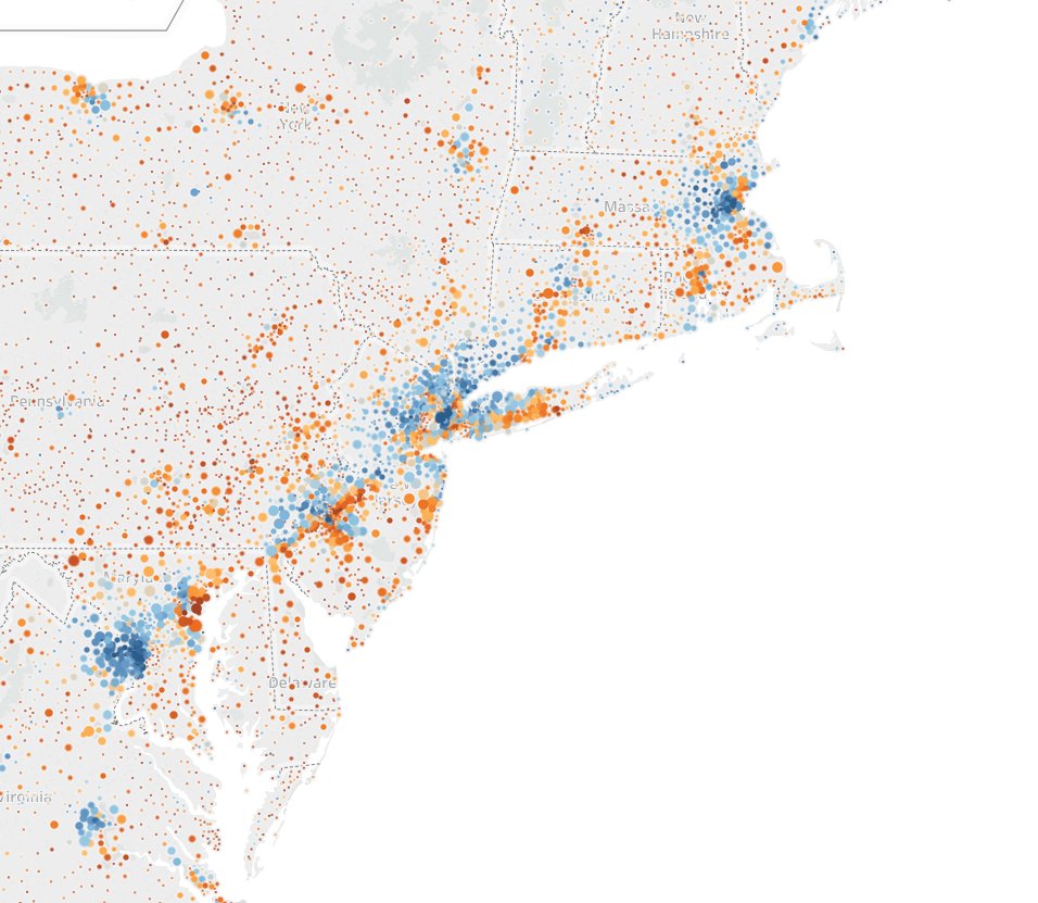 In California, the large scale segregation is clear here. The educated millennials have filled in the coastal metropolises, except for a few of the worst parts of LA. And, those without degrees have been pushed out to the Inland Empire.